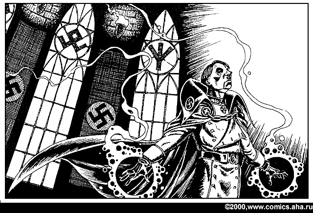 This awesome work was found at http://www.comics.aha.ru/, a Russian comic site. The original Russian dialog was in the captions, with English translation in the corresponding HTML. I took the liberty of rendering the English text within the images. Below is the Russian epic, "Hitler vs. Stalin"!