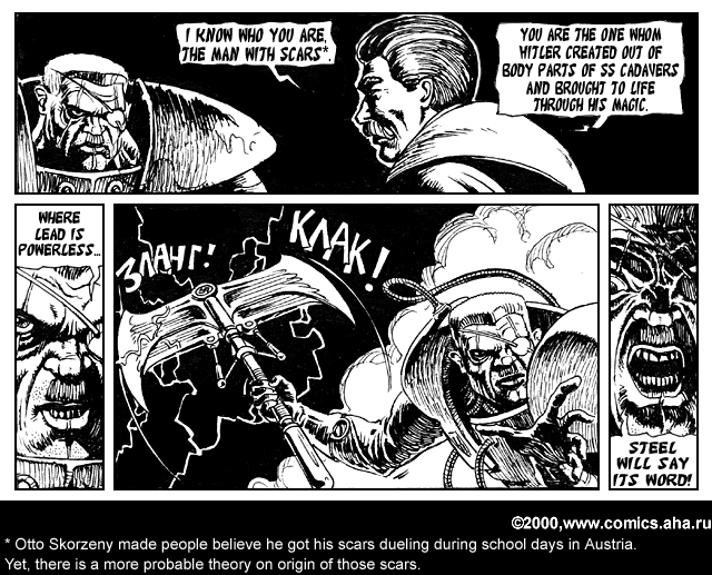 This awesome work was found at http://www.comics.aha.ru/, a Russian comic site. The original Russian dialog was in the captions, with English translation in the corresponding HTML. I took the liberty of rendering the English text within the images. Below is the Russian epic, "Hitler vs. Stalin"!