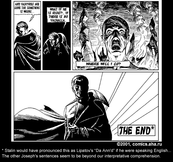 This awesome work was found at http://www.comics.aha.ru/, a Russian comic site. The original Russian dialog was in the captions, with English translation in the corresponding HTML. I took the liberty of rendering the English text within the images. Below is the Russian epic, "Hitler vs. Stalin"!
