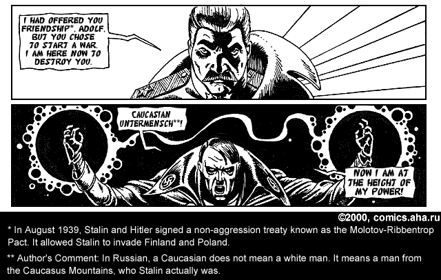 This awesome work was found at http://www.comics.aha.ru/, a Russian comic site. The original Russian dialog was in the captions, with English translation in the corresponding HTML. I took the liberty of rendering the English text within the images. Below is the Russian epic, "Hitler vs. Stalin"!